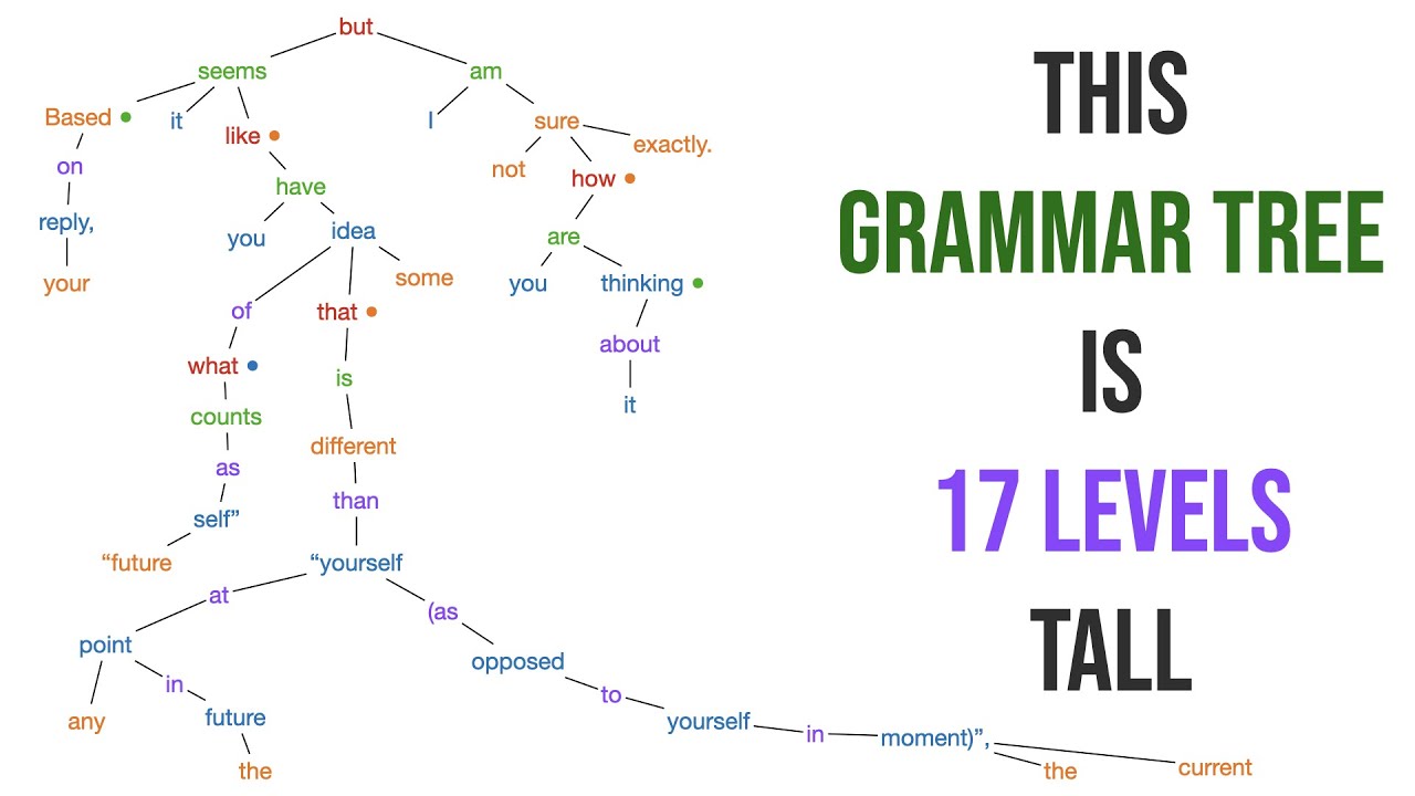 We’ll look at a real sentence from a forum discussion. It’s 17 levels due to heavy nesting, but tree diagrams can handle it.