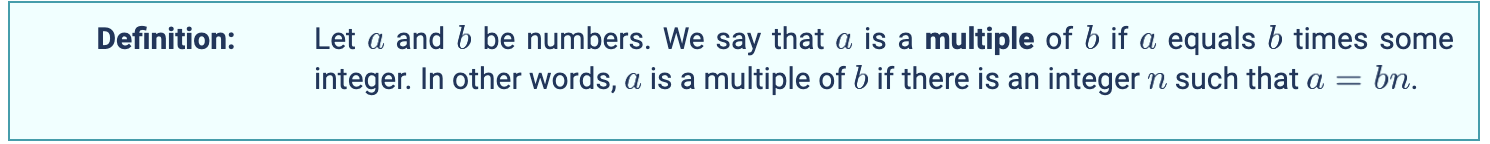 Oh yeah the integer part is important because otherwise all numbers could be “multiples” of each other because of fractions. Saying 10 is a “multiple” of 3, because 3 times 10/3 equals 10 is not helpful.