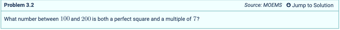 Well it can’t be 7^2 since that is 49. The next multiple of 7 is 14. 14^2 = 196. 196 is a perfect square (it is the product of 14 x 14), is between 100 and 200, and is a multiple of 7 (14/7 = 2).