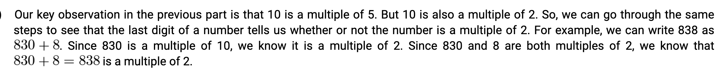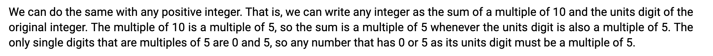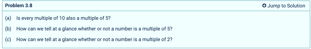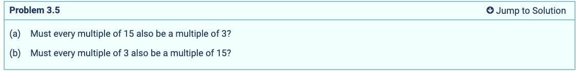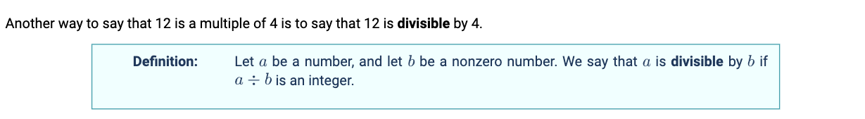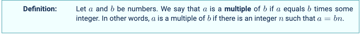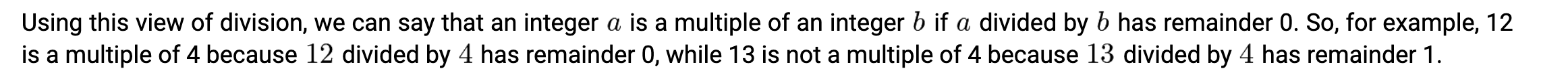 - Using the remainder view(?) of division, if a/b has remainder 0, or if a/b = some integer, then a is a multiple of b.