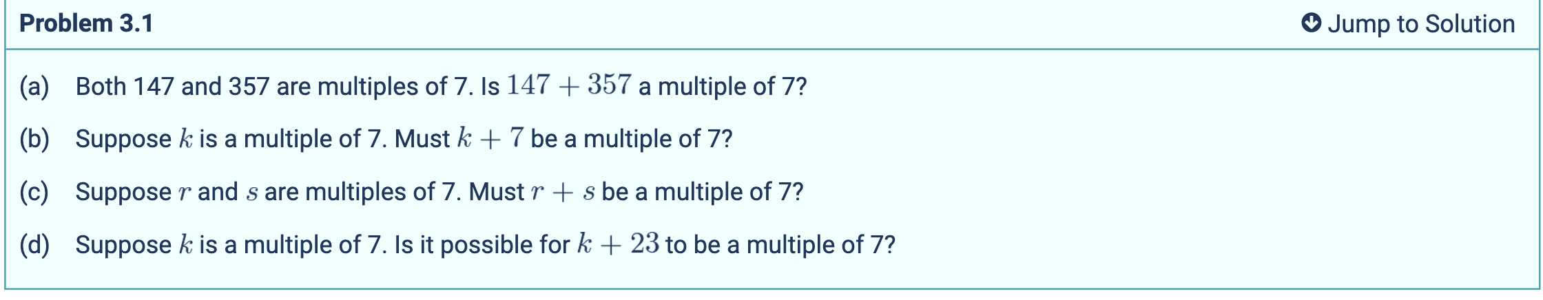 b.) k = 7n with n being some integer. must k + 7 be a multiple of 7? Yes. k = 7n, k + 7 = 7n + 7 = 7(n+1) which is a multiple of 7 as n+1 is some integer plus 1 which ends up just being some integer