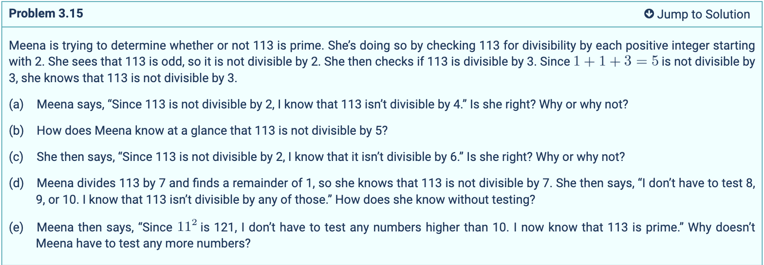 e) I’ve thought of this before so let’s try and recall this again. We only have to check up to 11^2 because if 113 is not composed of the numbers 2-11 it cannot be composed by anything larger. if we go to the next term 12 we know that it cannot be composed of 1-11 (from all our previous tests) but if we multiply it against 12 we will definitely get some bigger than 113. We stop at 11^2 because it is greater than 113 and if it is not composed of the numbers before 11 it cannot be composed of the numbers after.