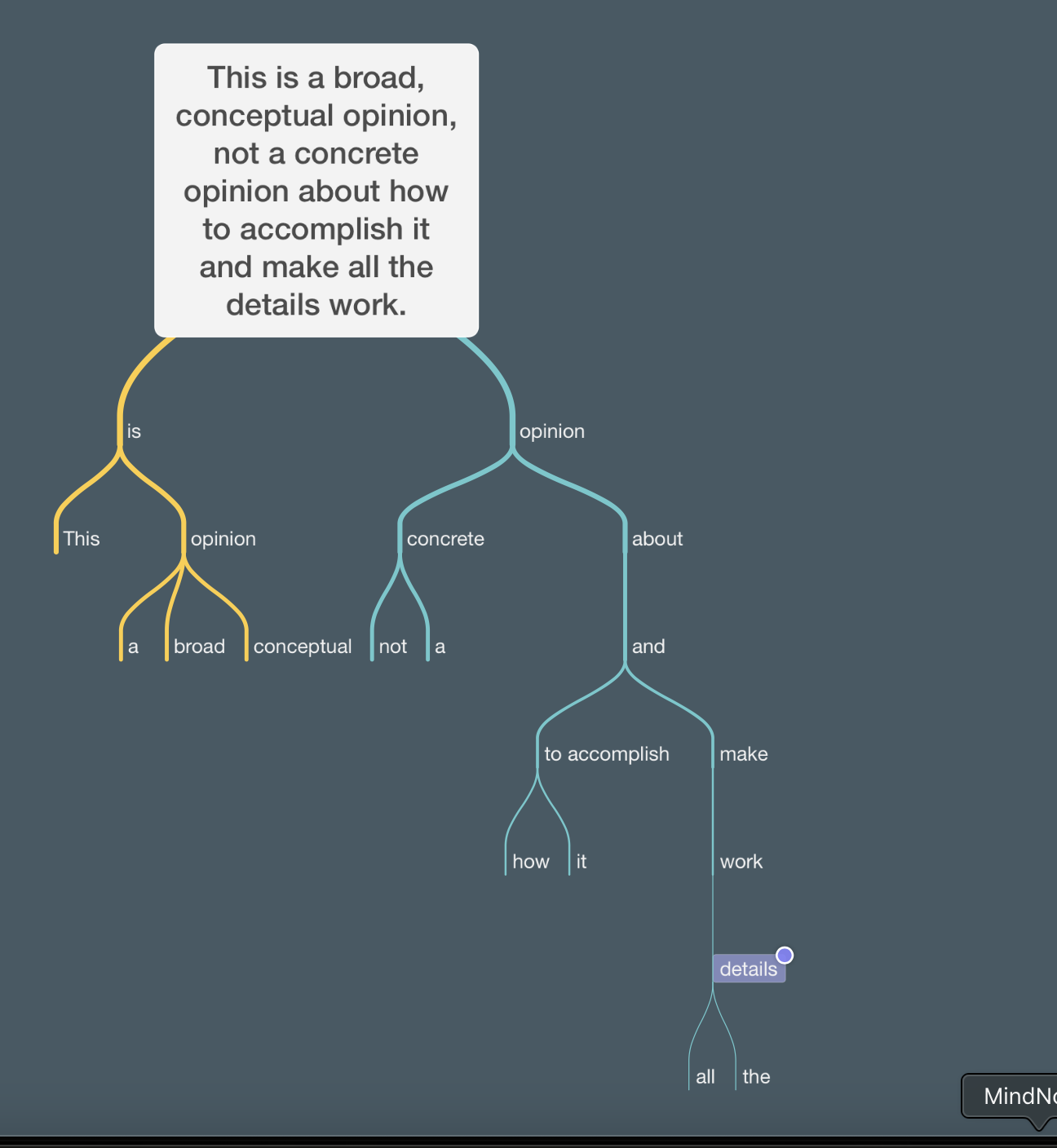 yeah. so “not a concrete opinion about how to” applies to the entire subtree “accomplish it and make all the details work”. The “and” means both/all of its children/descendants.