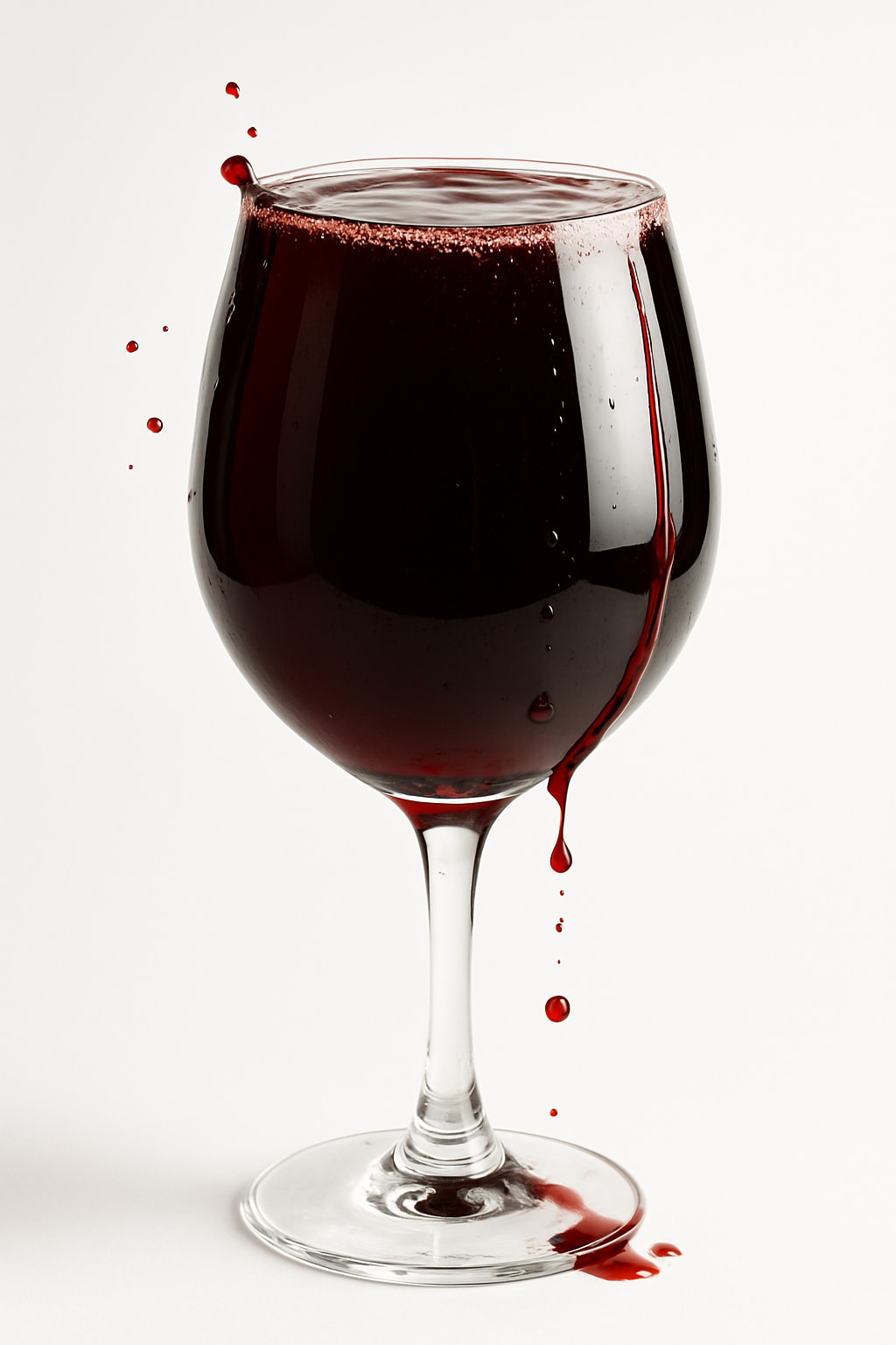 “A full glass of red wine filled to the brim and slightly spilling over the edge, with droplets and a small trickle of wine running down the outside of the glass. The glass is a classic wine glass shape. Clean white background. Photorealistic, high quality, studio lighting.”