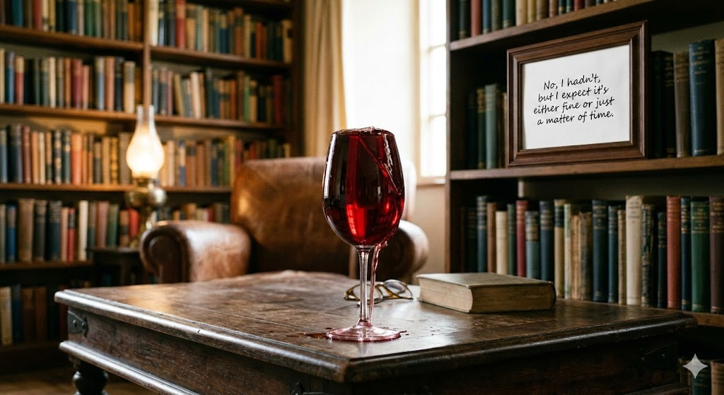 Generate image: an overflowingly full glass of wine on a coffee table in a rustic countryside library with a picture frame behind; in the picture frame it says “No, I hadn’t, but I expect it’s either fine or just a matter of time.”