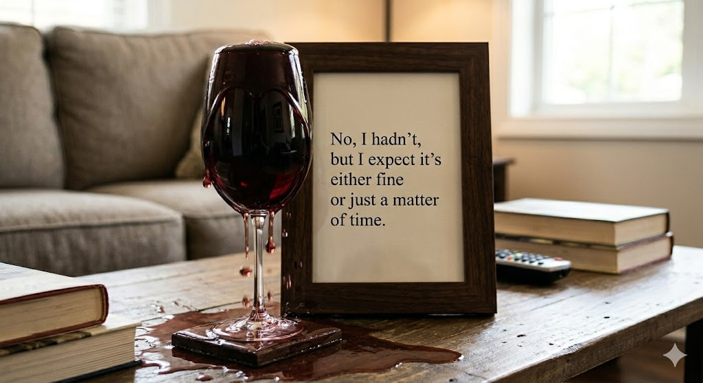 Generate image: a full glass of wine on a coffee table with a picture frame behind; in the picture frame it says “No, I hadn’t, but I expect it’s either fine or just a matter of time.”