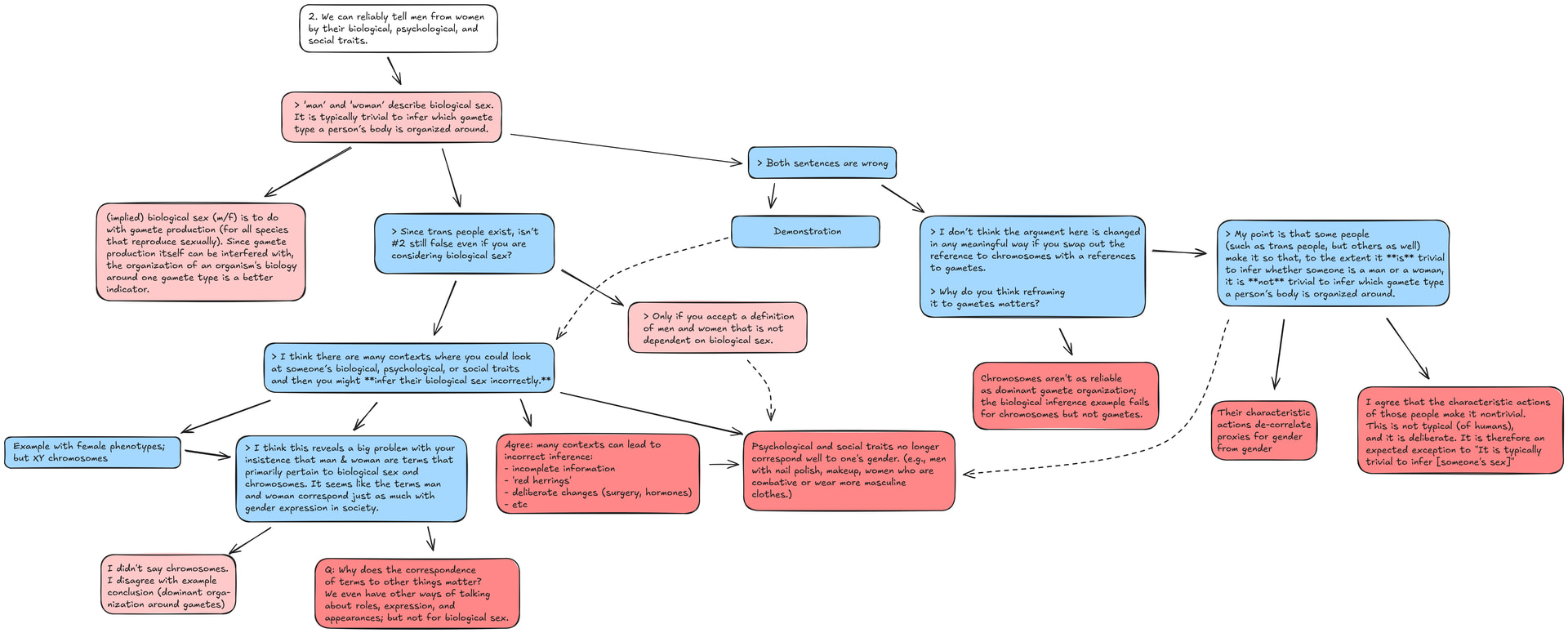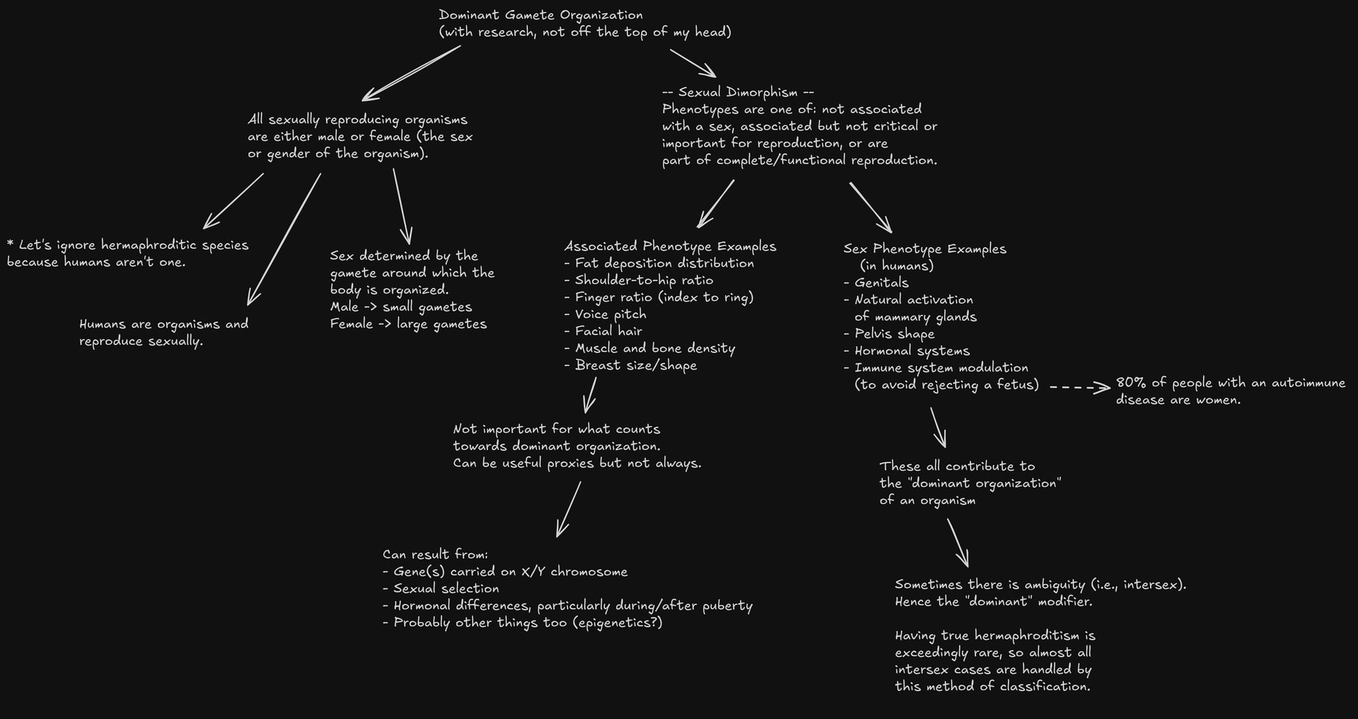 I think yes, but also I did not do a good job of understanding you to begin with. It’s useful for some other related disagreements we have, like you seem to think that I’d see a woman without a womb/ovaries as male. Hopefully the discussion tree helps demonstrate why I don’t see it like that (even internal testes wouldn’t be enough for me to consider them male, since the dominant biological organization (e.g., breasts, wider hips, etc) would still be around large gamete production).
