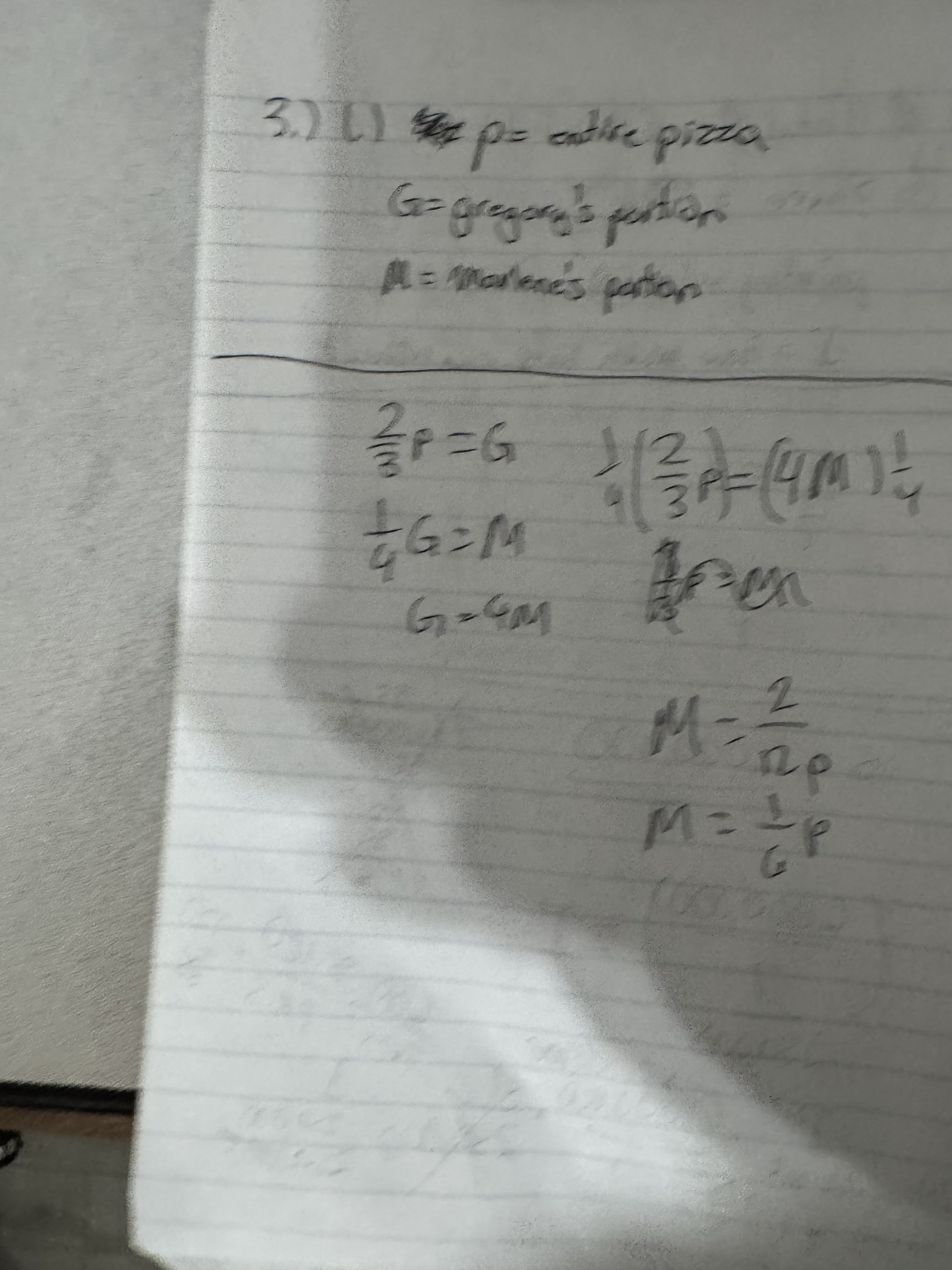I get that. I think my bigger confusion is the later part of the question. So if he were to give away 1/4 of an entire pizza to Marlene (so we’re giving 1/4 of an entire pizza no?), then what are we talking about with the “fraction of his partial pizza”?