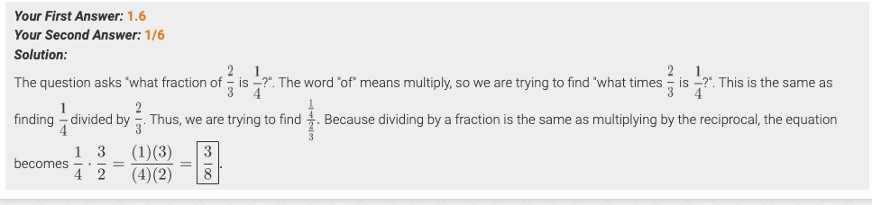 3.) Got this wrong. I dislike the wording of this question. Apparently we were looking for what fraction do we take out of 2/3 to get 1/4. I read it as he has 2/3 of a pizza, he then proceeds to give 1/4 of that 2/3 away. Is my reading comprehension the issue here?