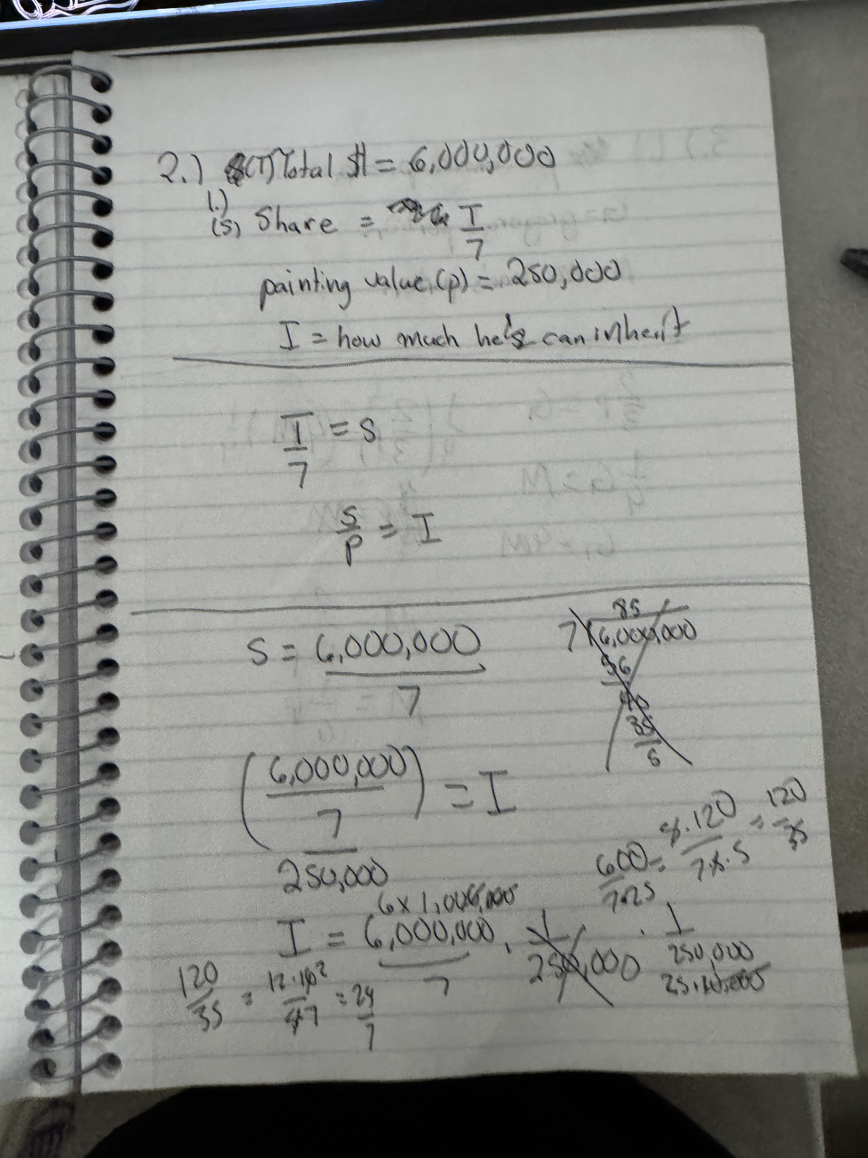 Doing work neatly and using as many pages as needed (or a computer) is an important skill or attitude. You need to improve at that to get the problems right. You also need to be able to get the arithmetic right and need to check if your answers make sense. You can’t rip paintings up into pieces. Your answer shouldn’t be a fraction. Also you wanted to give him less than one painting. But he should be getting close to a million dollars, which should clearly be more like 2 or 3 paintings. You’re treating the numbers as totally arbitrary and meaningless, and just trusting whatever your calculation says, instead of paying attention to them and thinking about them.