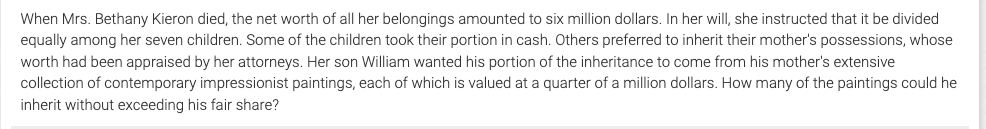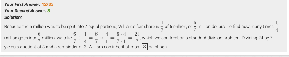 Oh yeah: I remember now, because the answer didn’t work out to an even division I just assumed it was a weird problem where the paintings aren’t actual good representations (like how I mentioned above) and I would put a decimal. That also played a part in why I just kinda ignored the issue with how many paintings he should’ve gotten. I did think why did he not get enough, but my mentality was like “Ehh crappy problem”, not that I messed up (at least initially).