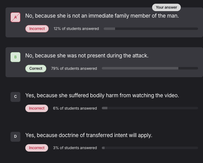 So I already looked at the explanation before writing why I think I got this wrong, but my initial thoughts were an issue of order. In my head I got the order wrong and this was a “choose the best answer” type of question. I assumed that B was right because you need to be present at the attack and then we need to take into considerations such as whether you’re a family member or not. Explanation: