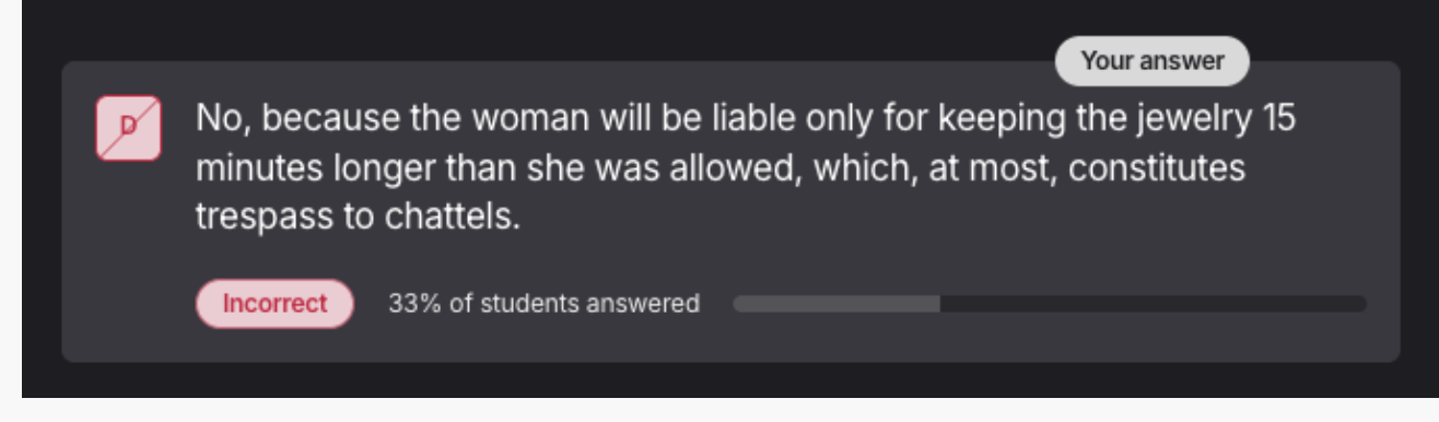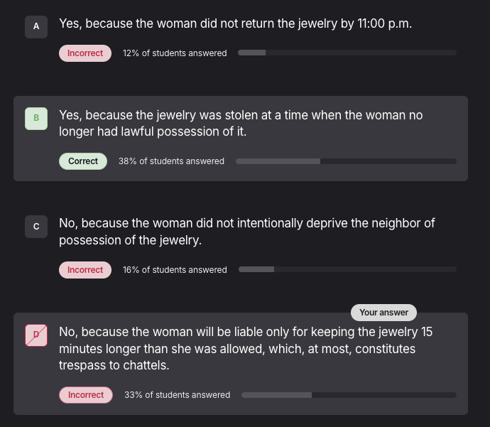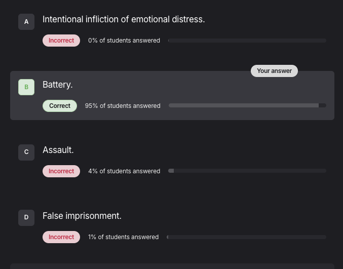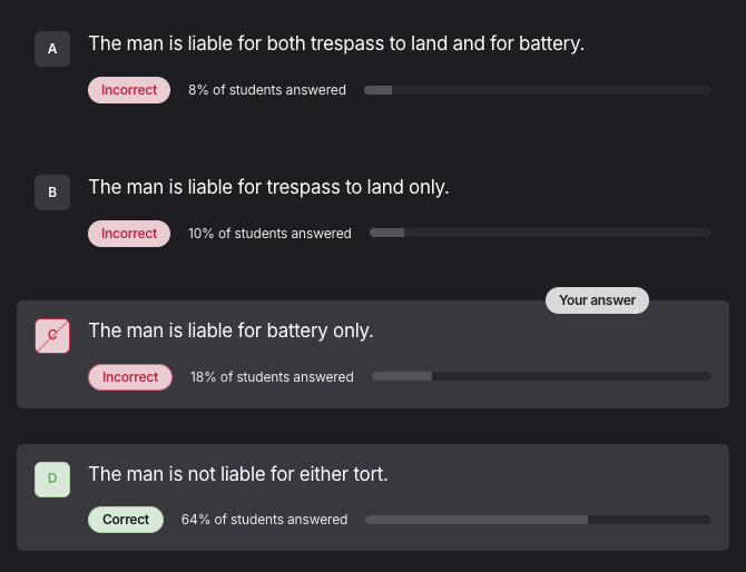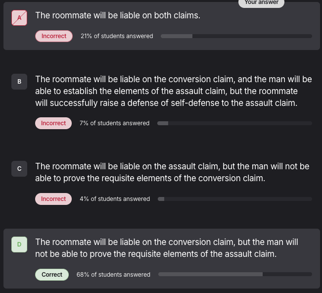 Ok. Without looking at the explanation just yet, I think I got this wrong due to sloppy reading. The man filed for assault and conversion charges. Yeah, no. Assault, more or less, is when you think battery will happen to you. The man didn’t think battery was going to happen to him, it just did. He has a battery charge, not an assault charge. I think I took assault as battery when I first read this.