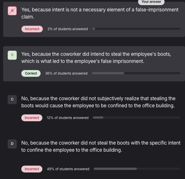 Because this scenario kind of felt like that I assumed there was no intent element needed. To me this felt like false imprisonment, but I wasn’t fitting my understanding of intent about it. So I just kinda went with no intent.
