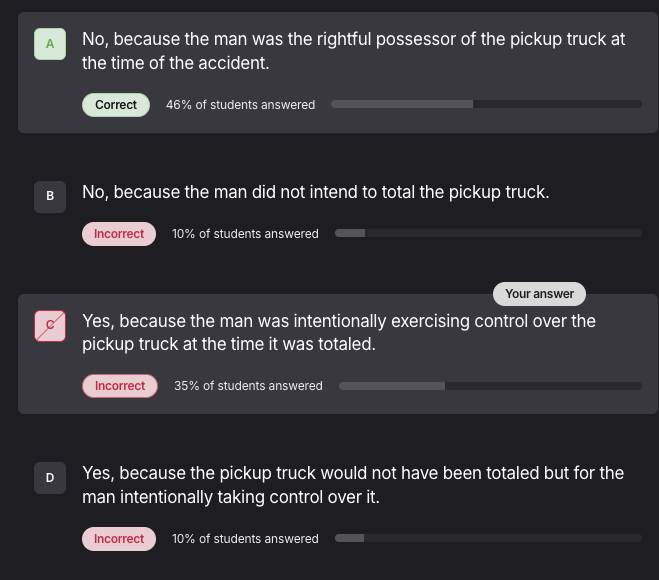 Answer option A is correct. A person may be found liable for conversion of chattels when he or she (1) intentionally exercises dominion or control over the personal property of another, and (2) this dominion or control so seriously interferes with the right of the true owner or rightful possessor to control the property that the person may justly be required to pay the other the full value of the property. A defendant cannot be liable for conversion where the defendant himself had rightful possession of the chattel. Here, the neighbor loaned the pickup truck to the man, so the man was the rightful possessor of the truck as long as he was acting within the scope of the neighbor’s grant of permission, which he was at the time of the accident. The rightful possessor cannot interfere with his own rights by exercising dominion and control over the chattel. Answer option B is incorrect because the intent element of the tort of conversion does not require that the defendant intend any particular harm to the plaintiff. Answer options C and D are incorrect because, regardless of the circumstances under which the truck was totaled, the man was the rightful possessor of the truck at the time of the accident. Note that the neighbor may have a successful cause of action against the man for negligence but may not prevail on a conversion claim.