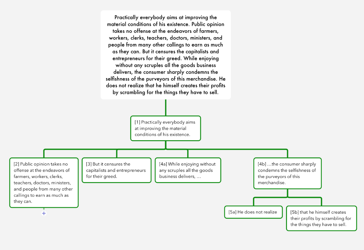 I think 4a and 4b are siblings, they’re both parts of group together. So what are they a child of? They seem like could be a child of 3, because they are on the topic of capitalists and entrepreneurs. They’re about consumers condemning selfishness of businesses, that’s what 3 is about. But, it also seems like it could be a child of 1. I’m unsure. I’m going to move on because I’m stuck too long.