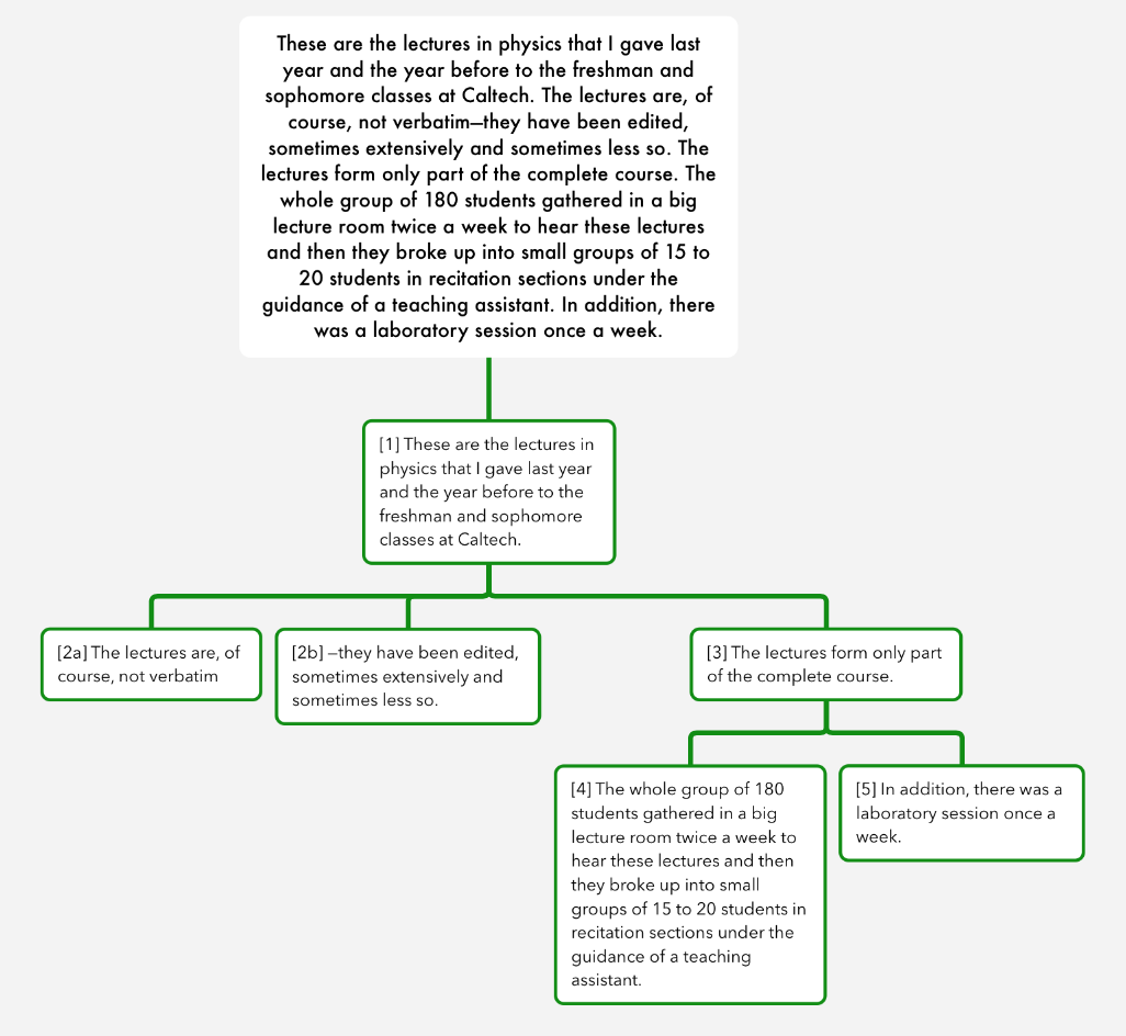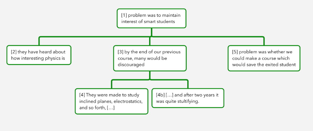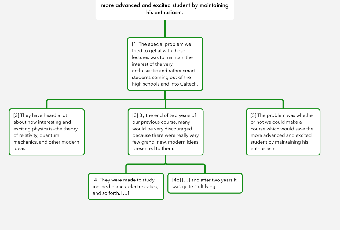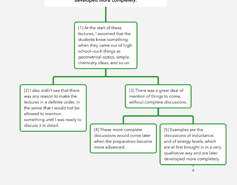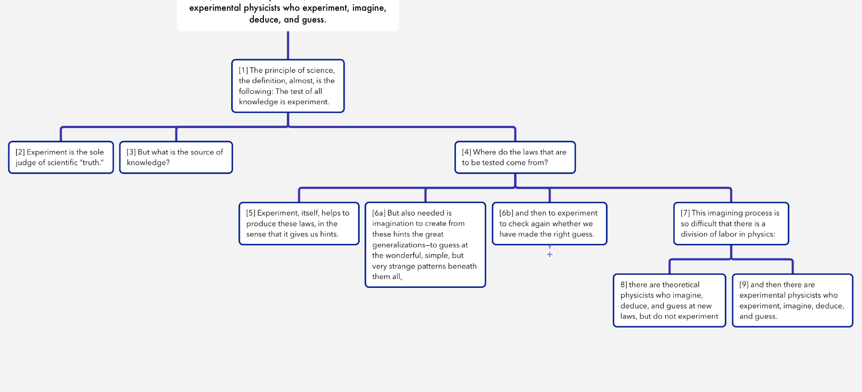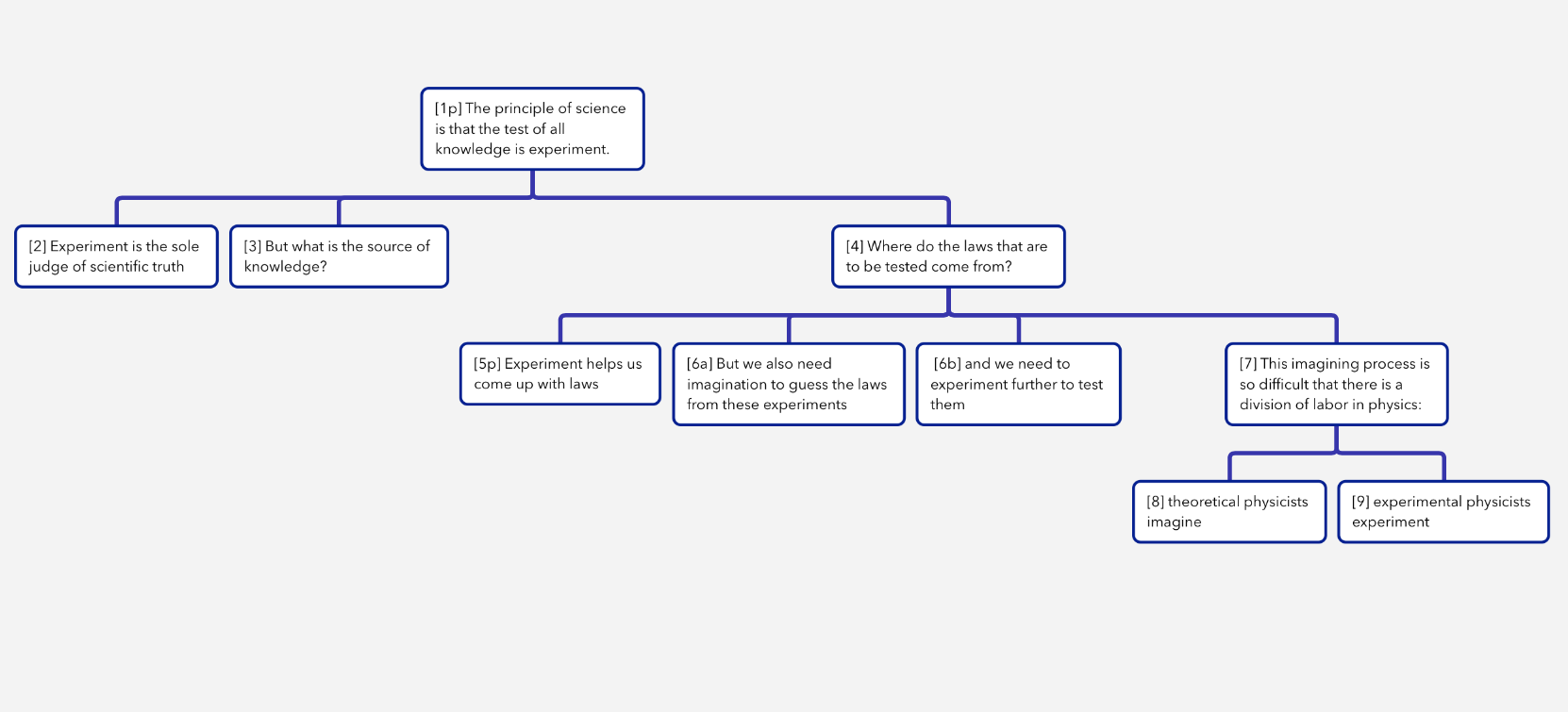 I think 1 is the root node. The topic is what science is about. He’s saying it’s about testing. I’m trying to paraphrase it. I think if I paraphrased it to “The principle of science is testing by experiment”, I would be changing the meaning. I guess it’s that I’m familiar with the epistemology issues here that it seems like changing it even slightly changes the meaning a lot. I’m going to just simplify it a bit and make it “The principle of science is that the test of all knowledge is experiment.”