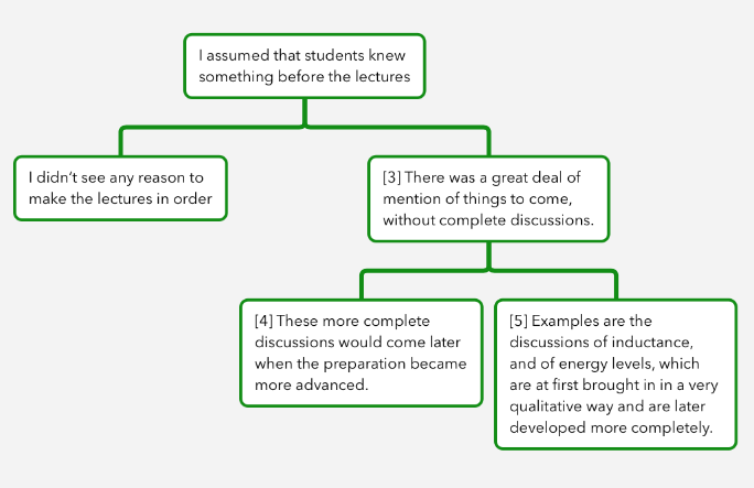 [5] Examples are the discussions of inductance, and of energy levels, which are at first brought in in a very qualitative way and are later developed more completely.