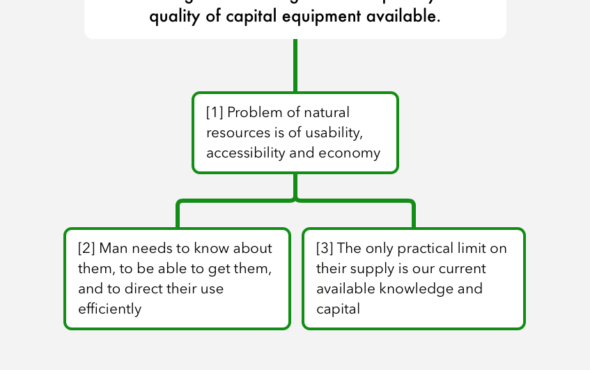 [3] Clearly, the only effective limit on the supply of such economically useable natural resources—that is, natural resources in the sense in which they constitute wealth—is the state of scientific and technological knowledge and the quantity and quality of capital equipment available.