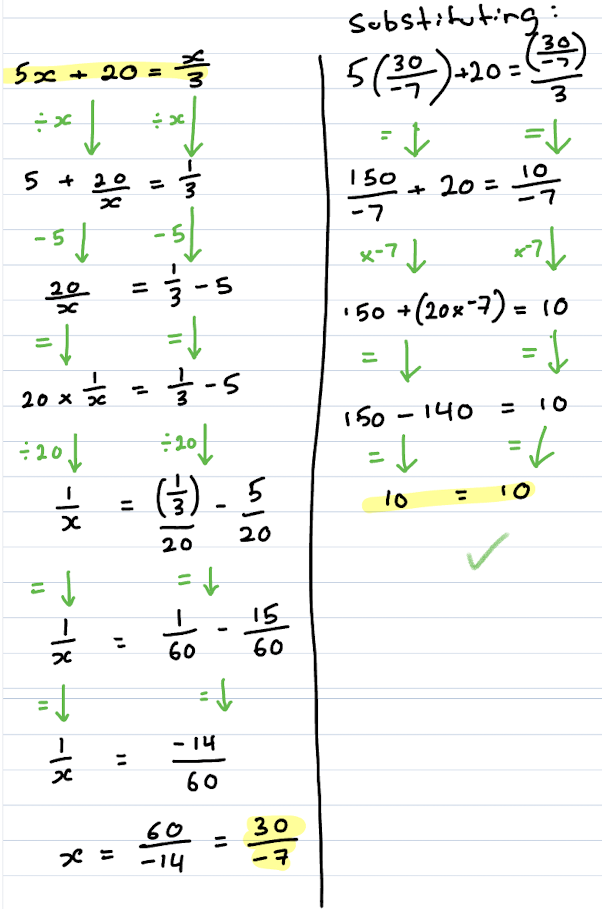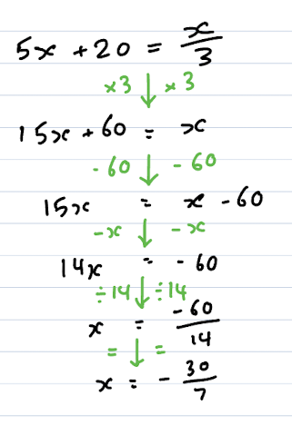 Is the equation 5x+20=x/3 that far beyond that? Why is 5x+20=3/x harder?