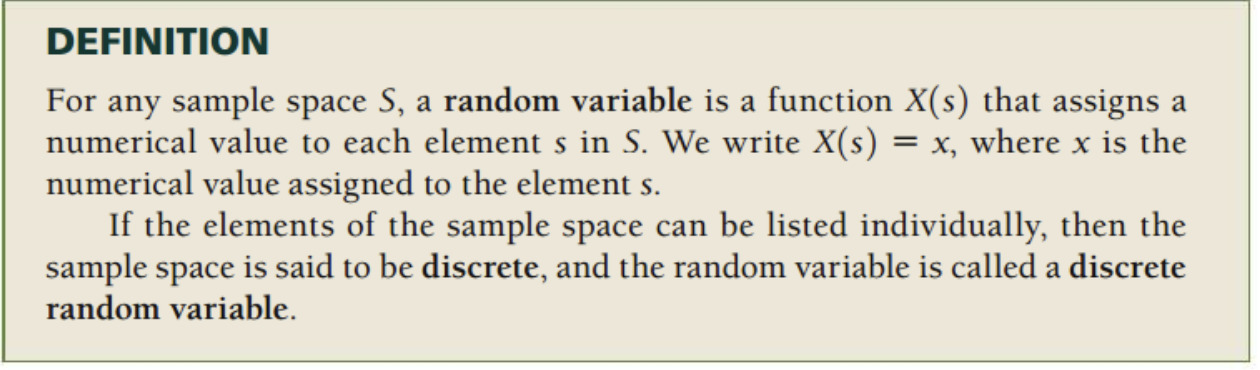 So random variable in this context refers to a specific function. Ok. X(s) = x, where X(s) is representing some element in the sample space, s being some element in the sample space, and x being the value giving to some element s.